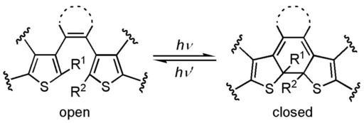 Keywords: Diarylethene photochromism.png Photochromism of diarylethene 1 2-dithienylethene Source Selfmade Date 5 Aug 2006 Made with ChemDraw 2006-08-05 own assumed Su-no-G