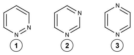 Keywords: Diazine isomers.png Diazine isomers without name edit by myself 1 pyridazine 1 2-diazine <br/> 2 pyrimidine 1 3-diazine <br/> 3 pyrazine 1 4-diazine 2006-01-18 own assumed Luigi Chiesa Diazines