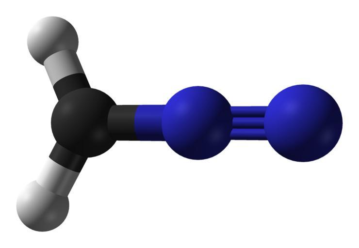 Keywords: Diazomethane-from-CRC-MW-IR-3D-balls-single-triple.png Ball-and-stick model of the diazomethane molecule H<sub>2</sub>CN<sub>2</sub> showing the resonance form with a CN single bond and an NN triple bond Structural information determined by microwave and infrared spectroscopy from http //www hbcpnetbase com/ CRC Handbook 88<sup>th</sup> edition Image generated in http //accelrys com/products/discovery-studio/visualization/discovery-studio-visualizer html Accelrys DS Visualizer Own 2009-05-25 Ben Mills Benjah-bmm27 Images by Ben Mills Ball-and-stick models Diazomethane Triple bond |