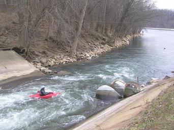 Keywords: Dickerson Course Finish.jpg en Much of the time the Potomac River level is high enough to make the final drop disappear Own HowardMorland 2007-02-11 Dickerson Whitewater Course