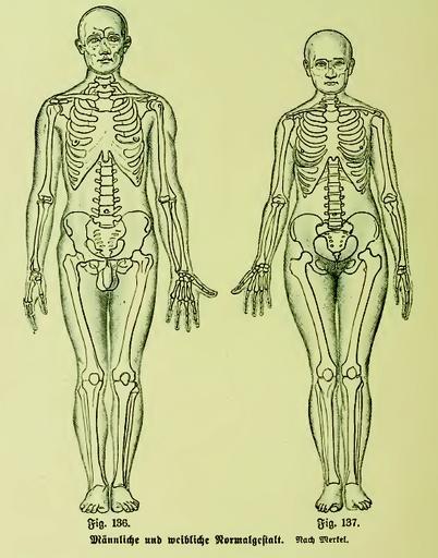 | Keywords: Die Frau als Hausärztin (1911) 136 137 Männliche und weibliche Normalgestalt.png  de Fig 136 und 137 Männliche und weibliche Normalgestalt <small>Nach Merkel </small> 1911 Die Frau als Hausärztin Mit 485 Original-Illustrationen 38 Tafeln und Kunstbeilagen in feinstem Farbendruck dem Porträt der Verfasserin und einem Modell-Album Mann und Weib 800 000 Jubiläumsausgabe Süddeutsches Verlagsinstitut Stuttgart 1911 diefraualshaus00fiscuoft Creator Anna Fischer-Dückelmann Custom license marker 2014 01 04 PD-US PD-old Illustrations from Die Frau als Hausärztin Uploaded with UploadWizard Anatomical plates and drawings in German Anatomical plates and drawings of human bones Human skeletal diagrams Human skeletons |