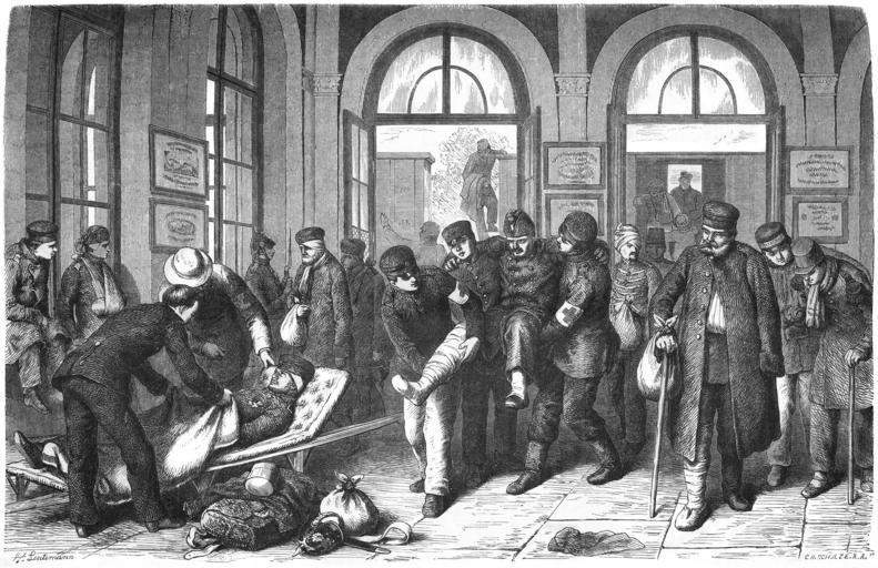 Keywords: Die Gartenlaube (1870) b 673.jpg Erste Hülfe im Sanitätsdienst nach Ankunft eines Verwundetenzugs <br />Nach der Natur aufgenommen von H Leutemann 673 674 Die Gartenlaube Franco-Prussian War Heinrich Leutemann