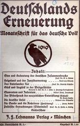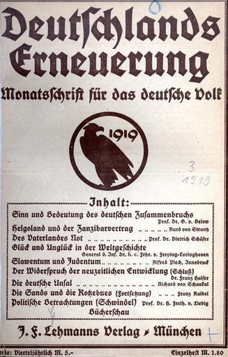 | Keywords: Die Zeitschrift der Völkischen Bewegung, 1919.jpg Titelblatt der Zeitschrift Deutschlands Erneuerung 3 Jg Heft 1 1919 erschienen im J F Lehmanns Verlag München Historisches Lexikon Bayerns 1919 author PD-old Weimar Republic Nationalism Newspapers of Germany |