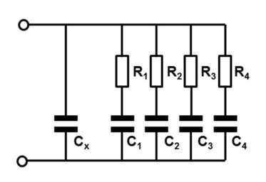 Keywords: Dielektrische Absorption.png de Schaltungsmodell zur Erklärung eines zeitverzögerten Spannungsaufbaus bei der dielektrischen Absorption durch parallel geschaltete RC-Zeitglieder own Elcap CC0 1 0 Capacitor diagrams Cc-zero