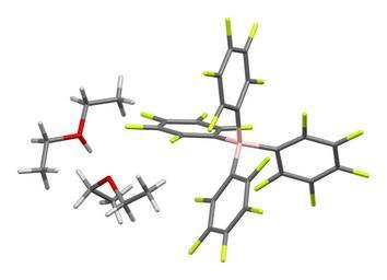 | Keywords: Diethyl-ether-oxonium-BArF-salt-from-xtal-2000-Mercury-3D-sticks.png Stick model of the salt H OEt<sub>2</sub> <sub>2</sub><sup>+</sup>B C<sub>6</sub>F<sub>5</sub> <sub>4</sub><sup> </sup> i e C<sub>32</sub>H<sub>21</sub>BF<sub>20</sub>O<sub>2</sub> as found in the crystal structure The salt is similar to Brookhart's Acid as both contain the protonated diethyl ether cluster Et<sub>2</sub>O “H<sup>+</sup>···OEt<sub>2</sub> Colour code 848484 Carbon C grey FFFFFF Hydrogen H white FFC0C0 Boron B pink D4F03F Fluorine F yellow-green F00000 Oxygen O red Structure determined by X-ray crystallography reported in http //dx doi org/10 1021/om990612w Organometallics 2000 19 1442 “1444 XEKFUO Model manipulated and image generated in http //www ccdc cam ac uk/products/mercury/ CCDC Mercury 3 0 Own 2012-11-15 Ben Mills Benjah-bmm27 Images by Ben Mills 3D-sticks models Diethyl ether Oxonium compounds Tetrakis pentafluorophenyl borates |
