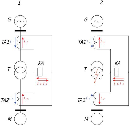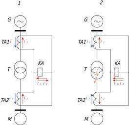 | Keywords: Diff protection.svg Схема п одольной диффе енциальной защиты G - гене ато - двигатель T - силовой т ансфо мато TA1 TA2 - изме ительные т ансфо мато ы тока KA - обмотка еле тока 1 - но мальный ежим 2 - ко откое замыкание на защищаемом т ансфо мато е T Own 2008-03-04 FearChild One-line diagrams |