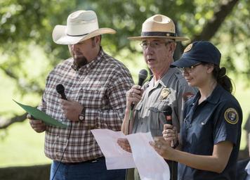 | Keywords: dsc_7118.nef dsc7118nef austin tx usa outdoor LBJ ranch hand Clint Herriman, Park Ranger Brian Vickers and park volunteer Maddie Pruneda read the names of the 47 national park units established during Lyndon Johnson’s presidency. The Lyndon B. Johnson National Historical Park celebrated the 108th anniversary of President Johnson’s birth with a ceremony at 10:00 am on Saturday, August 27. Continuing a tradition that Lady Bird Johnson began in 1973, a wreath was placed at the president’s gravesite in the Johnson family cemetery at the LBJ Ranch by Park Superintendent Russ Whitlock and Brigadier General Heather L. Pringle. After the ceremony, park staff members commemorated the National Park Service Centennial by reading the names of the 47 national park units established during Lyndon Johnson’s presidency. LBJ Library photo by Jay Godwin 08/27/2016 LBJ ranch hand Clint Herriman, Park Ranger Brian Vickers and park volunteer Maddie Pruneda read the names of the 47 national park units established during Lyndon Johnson’s presidency. The Lyndon B. Johnson National Historical Park celebrated the 108th anniversary of President Johnson’s birth with a ceremony at 10:00 am on Saturday, August 27. Continuing a tradition that Lady Bird Johnson began in 1973, a wreath was placed at the president’s gravesite in the Johnson family cemetery at the LBJ Ranch by Park Superintendent Russ Whitlock and Brigadier General Heather L. Pringle. After the ceremony, park staff members commemorated the National Park Service Centennial by reading the names of the 47 national park units established during Lyndon Johnson’s presidency. LBJ Library photo by Jay Godwin 08/27/2016 |
