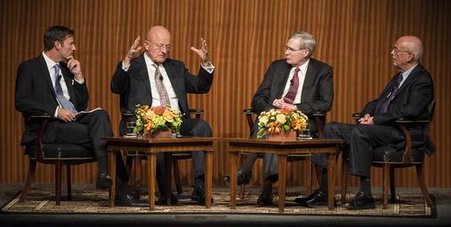 | Keywords: dig13939_37.nef dig1393937nef austin tx usa Mark Updegrove, James Clapper, Stephen Hadley and Bob Inman In a speech at the LBJ Presidential Library on Thursday, Sept. 22nd, 2016, Director of National Intelligence James Clapper discussed national security as we prepare for an election year change in the White House. Following his remarks, Admiral Bob Inman, former Director of the National Security Agency and Deputy Director of the CIA, and Stephen Hadley, former National Security Advisor, joined Clapper on stage for a conversation moderated by LBJ Library Director Mark Updegrove on the pressing national security issues facing our nation. LBJ Library photo by Jay Godwin 09/22/2016 Mark Updegrove, James Clapper, Stephen Hadley and Bob Inman In a speech at the LBJ Presidential Library on Thursday, Sept. 22nd, 2016, Director of National Intelligence James Clapper discussed national security as we prepare for an election year change in the White House. Following his remarks, Admiral Bob Inman, former Director of the National Security Agency and Deputy Director of the CIA, and Stephen Hadley, former National Security Advisor, joined Clapper on stage for a conversation moderated by LBJ Library Director Mark Updegrove on the pressing national security issues facing our nation. LBJ Library photo by Jay Godwin 09/22/2016 |