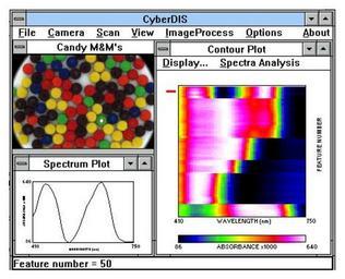 Keywords: Digital Imaging Spectroscopy 1.JPG Full spectrum of a plate of M Ms candy Own 1998 Doug youvan Digital image spectroscopy