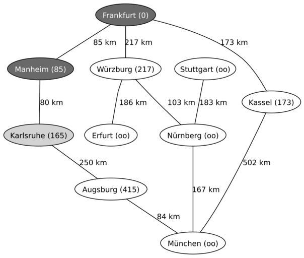 Keywords: DijkstraStep03.svg Third Step of a run of Dijkstra's algorithm on a map of Germany see Image MapGermanyGraph svg Created by de Benutzer Regnaron with graphviz Dijkstra's algorithm