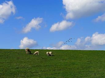 Keywords: dike clouds sheep north sea sky landscape grass nature coast sea mood blue relaxation meadow pasture flock of sheep birds wool agriculture flock animals graze herd animals sheep's wool green eat white