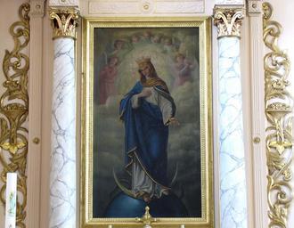 | Keywords: Dingsheim StKilian 24.JPG Alsace Bas-Rhin Dingsheim Eglise St Kilian Autel secondaire Vierge Marie XIXe Tableau 1927 own 2012 Ralph Hammann cc-by-sa-3 0 Artwork / Œuvre d'art / Kunstwerk oil canvas cm 267 140 Eglise Saint-Kilian Dingsheim IM67009467 object history other versions Ralph Hammann PD-old accession number Altars in Église Saint-Kilian de Dingsheim Photographs of Dingsheim by Ralph Hammann Taken with Canon PowerShot SX20 IS Paintings of Immaculata Church paintings in Bas-Rhin 20th-century paintings of Immaculata 1927 oil on canvas paintings in France Neoclassical church paintings in Alsace 20th-century church paintings in Alsace 1927 works in Alsace Madonna on the crescent Paintings of putti in France 20th-century paintings of putti |