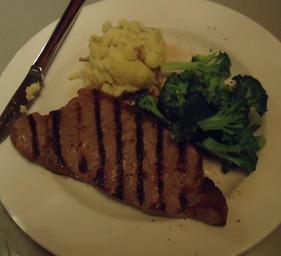 | Keywords: Dinner at a restaurant with steak and potatoes and broccoli.jpg en Steak dinner at a restaurant in Summit New Jersey includes broccoli and potatoes 2013-03-29 06 42 05 own Tomwsulcer cc-zero Uploaded with UploadWizard Beef steaks Broccoli-based food |