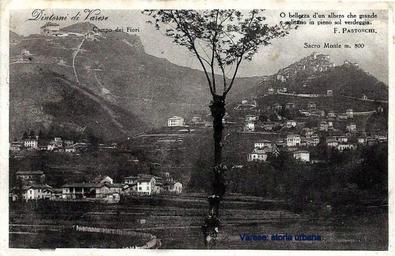 | Keywords: La stretta valle del Vellone chiusa tra Campo dei Fiori (a sinistra) e Santa Maria del Monte (a destra). Sulla sinistra in secondo piano uno scorcio dell'abitato di Velate, in basso in primo piano il centro abitato di Avigno, a destra le ville di Fogliaro. La lirica รจ di Francesco Pastonchi (1874-1953). varese velate |