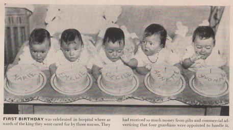 | Keywords: dionne quintuplets girl rare 1950 architecture I found the story of there lives in a box, so I wanted to give it to the world. This is there story. All photos are creative commons for they are not my work. I found it hard to believe some person would spend a lifetime collecting everything about them and then just sell them at a market. The Dionne Quintuplets (born May 28, 1934) are the first quintuplets known to survive their infancy. The sisters were born in Canada south of North Bay, Ontario, just outside Callander, Ontario, near the village of Corbeil. The Dionne girls were born two months premature. After four months with their family, they were made Wards of the King for the next nine years under the Dionne Quintuplets' Guardianship Act, 1935. The government and those around them began to profit by making them a significant tourist attraction in Ontario. I found the story of there lives in a box, so I wanted to give it to the world. This is there story. All photos are creative commons for they are not my work. I found it hard to believe some person would spend a lifetime collecting everything about them and then just sell them at a market. The Dionne Quintuplets (born May 28, 1934) are the first quintuplets known to survive their infancy. The sisters were born in Canada south of North Bay, Ontario, just outside Callander, Ontario, near the village of Corbeil. The Dionne girls were born two months premature. After four months with their family, they were made Wards of the King for the next nine years under the Dionne Quintuplets' Guardianship Act, 1935. The government and those around them began to profit by making them a significant tourist attraction in Ontario. |