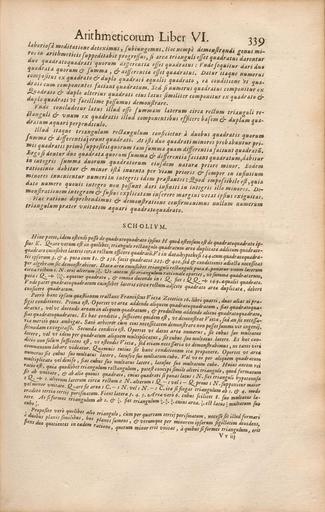Keywords: Diophantus-VI-24-20-Fermat.png <small> Area trianguli rectanguli in numeris non potest esse quadratus hujus theorematis a nobis inventi demonstrationem quam et ipsi tandem non sine operosa</small> laboriosa meditatione deteximus subiungemus Hoc nempe demonstrandi genus miros in arithmeticis suppeditabit progressus si area trianguli esset quadratus darentur duo quadratoquadrati quorum differentia esset quadratus Unde sequitur dari duo quadratos quorum summa differentia esset quadratus Datur itaque numerus compositus ex quadrato duplo quadrati æqualis quadrato ea conditione ut quadrati eum componentes faciant quadratum Sed si numerus quadratus componitur ex Quadrato duplo alterius quadrati eius latus similiter componitur ex quadrato duplo quadrati ut facillime possumus demonstrare <br /> Unde concludetur latus illud esse summam laterum circa rectum trianguli rectanguli unum ex quadratis illud componentibus efficere basem duplum quadratum æquari perpendiculo <br /> Illud itaque triangulum rectangulum conficietur a duobus quadratis quorum summa differentia erunt quadrati At isti duo quadrati minores probabuntur primis quadratis primo suppositis quorum tam summa quam differentia faciunt quadratu Ergo si dentur duo quadrata quorum summa differentia faciant quadratum dabitur in integris summa duorum quadratorum eiusdem naturæ priore minor Eodem ratiocinio dabitur minor ista inuenta per utam prioris semper in infinitum minores inuenientur numeri in integris idem præstantes Quod impossibile est quia dato numero quouis integro non possunt dari infiniti in integris illo minores Demonstrationem integram fusius explicatam inserere margini vetat ipsius exiguitas <br /> Hac ratione deprehendimus demonstratione confirmatus nullum numerum triangulum præter vnitatem æquari quadratoquadrato OBSERVATIO D P F Facsimile editions from André Weil Number Theory An Approach Through History From Hammurapi to Legendre p 78 Birkhäuser Springer 1984 Improved by Leonid 2 2015-01-27 PD-old GFDL Fermat's last theorem Arithmetica |