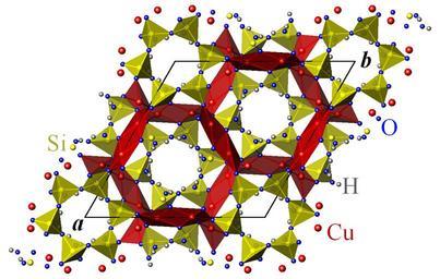 Keywords: Dioptase structure.png en Crystal structure of dioptase CuSiO3·H2O R-3 hexagonal cell projected onto the a b plane own Perditax 2010-09-13 Dioptase Copper compounds Cyclosilicates Crystal structures