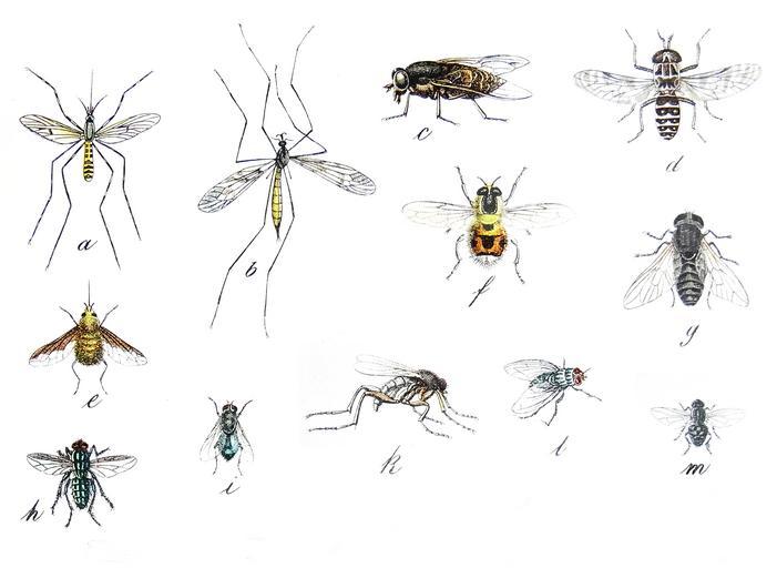| Keywords: Diptera3.jpg de Bearbeiteter Ausschnitt von Tafel XXIII<br> a Culex pipiens b Nephrotoma pratensis c Tabanus bovinus d Haematopota pluvialis e Bombylius major f Volucella bombylans g Gasterophilus nasalis h Sarcophaga carnaria i Calliphora vomitoria k Borophaga incrassata l Musca domestica m Stomoxys calcitrans Naturgeschichte des Tierreichs Heinrich von Schubert 1886 Unidentified Diptera Culex pipiens Nephrotoma pratensis Tabanus bovinus Volucella bombylans Gasterophilus nasalis Sarcophaga carnaria Borophaga incrassata Musca domestica Stomoxys calcitrans PD-old |