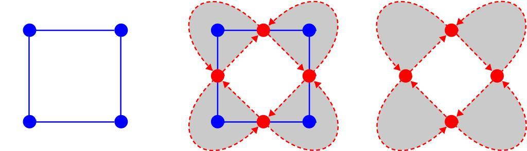 | Keywords: Directed medial graph example.svg en Example of a plane graph in blue and its directed medial graph in red <source lang latex > \documentclass standalone \usepackage tikz \usetikzlibrary arrows backgrounds positioning \begin document \def\nodeDist 2 5cm \def\arrowType triangle 60 \def\fillColor black 20 \def\position 0 6 \tikzstyle origVertex draw blue fill shape circle \tikzstyle newVertex draw red fill shape circle \tikzstyle invisibleVertex shape circle \tikzstyle origEdge blue \tikzstyle newEdge red densely dashed \tikzstyle invisibleEdge draw opacity 0 \begin tikzpicture node distance \nodeDist > \arrowType semithick \nodeorigVertex 0 ; \nodeorigVertex 1 right of 0 ; \nodeorigVertex 2 below of 1 ; \nodeorigVertex 3 left of 2 ; \path 0 edgeorigEdge nodeinvisibleVertex m0 1 1 edgeorigEdge nodeinvisibleVertex m1 2 2 edgeorigEdge nodeinvisibleVertex m2 3 3 edgeorigEdge nodeinvisibleVertex m3 0 ; \path m0 edgeinvisibleEdge m1 edgeinvisibleEdge out 45 in 45 looseness 3 overlay nodeinvisibleVertex pos \position e0 m1 m1 edgeinvisibleEdge m2 edgeinvisibleEdge out -45 in -45 looseness 3 overlay nodeinvisibleVertex pos \position e1 m2 m2 edgeinvisibleEdge m3 edgeinvisibleEdge out -135 in -135 looseness 3 overlay nodeinvisibleVertex pos \position e2 m3 m3 edgeinvisibleEdge m0 edgeinvisibleEdge out 135 in 135 looseness 3 overlay nodeinvisibleVertex pos \position e3 m0 ; \nodeinvisibleVertex below 0cm of e0 ; \nodeinvisibleVertex left 0cm of e1 ; \nodeinvisibleVertex above 0cm of e2 ; \nodeinvisibleVertex right 0cm of e3 ; \end tikzpicture \qquad \begin tikzpicture node distance \nodeDist > \arrowType semithick \nodeorigVertex 0 ; \nodeorigVertex 1 right of 0 ; \nodeorigVertex 2 below of 1 ; \nodeorigVertex 3 left of 2 ; \path 0 edgeorigEdge nodenewVertex m0 1 1 edgeorigEdge nodenewVertex m1 2 2 edgeorigEdge nodenewVertex m2 3 3 edgeorigEdge nodenewVertex m3 0 ; \path m0 edge-> newEdge m1 edge<- newEdge out 45 in 45 looseness 3 overlay nodeinvisibleVertex pos \position e0 m1 m1 edge-> newEdge m2 edge<- newEdge out -45 in -45 looseness 3 overlay nodeinvisibleVertex pos \position e1 m2 m2 edge-> newEdge m3 edge<- newEdge out -135 in -135 looseness 3 overlay nodeinvisibleVertex pos \position e2 m3 m3 edge-> newEdge m0 edge<- newEdge out 135 in 135 looseness 3 overlay nodeinvisibleVertex pos \position e3 m0 ; \nodeinvisibleVertex below 0cm of e0 ; \nodeinvisibleVertex left 0cm of e1 ; \nodeinvisibleVertex above 0cm of e2 ; \nodeinvisibleVertex right 0cm of e3 ; \begin scope on background layer overlay \fillfill \fillColor m0 45 to out 45 in 45 looseness 3 m1 45 to m1 center to m0 center to m0 45 ; \fillfill \fillColor m1 -45 to out -45 in -45 looseness 3 m2 -45 to m2 center to m1 center to m1 -45 ; \fillfill \fillColor m2 -135 to out -135 in -135 looseness 3 m3 -135 to m3 center to m2 center to m2 -135 ; \fillfill \fillColor m3 135 to out 135 in 135 looseness 3 m0 135 to m0 center to m3 center to m3 135 ; \end scope \end tikzpicture \qquad \begin tikzpicture node distance \nodeDist > \arrowType semithick \nodeinvisibleVertex 0 ; \nodeinvisibleVertex 1 right of 0 ; \nodeinvisibleVertex 2 below of 1 ; \nodeinvisibleVertex 3 left of 2 ; \path 0 edgeinvisibleEdge nodedraw opacity 100 newVertex m0 1 1 edgeinvisibleEdge nodedraw opacity 100 newVertex m1 2 2 edgeinvisibleEdge nodedraw opacity 100 newVertex m2 3 3 edgeinvisibleEdge nodedraw opacity 100 newVertex m3 0 ; \path m0 edge-> newEdge m1 edge<- newEdge out 45 in 45 looseness 3 overlay nodeinvisibleVertex pos \position e0 m1 m1 edge-> newEdge m2 edge<- newEdge out -45 in -45 looseness 3 overlay nodeinvisibleVertex pos \position e1 m2 m2 edge-> newEdge m3 edge<- newEdge out -135 in -135 looseness 3 overlay nodeinvisibleVertex pos \position e2 m3 m3 edge-> newEdge m0 edge<- newEdge out 135 in 135 looseness 3 overlay nodeinvisibleVertex pos \position e3 m0 ; \nodeinvisibleVertex below 0cm of e0 ; \nodeinvisibleVertex left 0cm of e1 ; \nodeinvisibleVertex above 0cm of e2 ; \nodeinvisibleVertex right 0cm of e3 ; \begin scope on background layer overlay \fillfill \fillColor m0 45 to out 45 in 45 looseness 3 m1 45 to m1 center to m0 center to m0 45 ; \fillfill \fillColor m1 -45 to out -45 in -45 looseness 3 m2 -45 to m2 center to m1 center to m1 -45 ; \fillfill \fillColor m2 -135 to out -135 in -135 looseness 3 m3 -135 to m3 center to m2 center to m2 -135 ; \fillfill \fillColor m3 135 to out 135 in 135 looseness 3 m0 135 to m0 center to m3 center to m3 135 ; \end scope \end tikzpicture \end document </source> Self 2013-03-26 Graph theory Images with LaTeX source code Cc-zero |