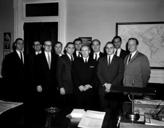 Keywords: u.s. national archives usnationalarchives jfk presidential library jfkpresidentiallibrary people groupshot blackandwhite monochrome black and white Original Caption: Director of Food for Peace, George McGovern, with Visitors We are looking for your help in identifying unknown people in our White House Photographs collection. If you have any information about this photograph, please post a comment, including any relevant sources, for the catalogers at the John F. Kennedy Presidential Library. Thank you! Local Identifier: JFKWHP-KN-17353 Created By: President (1961-1963 : Kennedy). Office of the Naval Aide to the President. (1961 - 1963) From: Robert Knudsen White House Photographs, 01/20/1961 - 12/19/1963 Contact: John F. Kennedy Library (LP-JFK), Columbia Point Boston, MA 02125-3398 Phone: 617-514-1600 Fax: 617-514-1652 Email: kennedy.library@nara.gov Production Dates: 3/17/1961 Scope and Content Note: This is a photograph of Director of Food for Peace and Special Assistant to the President, George McGovern (fourth from right), with ten unidentified men. Room 234, Executive Office Building, Washington, D.C. Persistent URL: JFK Library URL: www.jfklibrary.org/Asset-Viewer/Archives/JFKWHP-KN-17353.... Access Restrictions: Unrestricted Use Restrictions: Unrestricted Original Caption: Director of Food for Peace, George McGovern, with Visitors We are looking for your help in identifying unknown people in our White House Photographs collection. If you have any information about this photograph, please post a comment, including any relevant sources, for the catalogers at the John F. Kennedy Presidential Library. Thank you! Local Identifier: JFKWHP-KN-17353 Created By: President (1961-1963 : Kennedy). Office of the Naval Aide to the President. (1961 - 1963) From: Robert Knudsen White House Photographs, 01/20/1961 - 12/19/1963 Contact: John F. Kennedy Library (LP-JFK), Columbia Point Boston, MA 02125-3398 Phone: 617-514-1600 Fax: 617-514-1652 Email: kennedy.library@nara.gov Production Dates: 3/17/1961 Scope and Content Note: This is a photograph of Director of Food for Peace and Special Assistant to the President, George McGovern (fourth from right), with ten unidentified men. Room 234, Executive Office Building, Washington, D.C. Persistent URL: JFK Library URL: www.jfklibrary.org/Asset-Viewer/Archives/JFKWHP-KN-17353.... Access Restrictions: Unrestricted Use Restrictions: Unrestricted