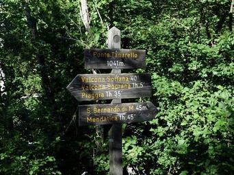 Keywords: directory signposts hiking trails direction marking shield note right next wooden signs