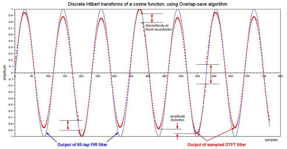 Keywords: Discrete Hilbert transforms of a cosine function, using piecewise convolution.jpg en The blue graph shows a sine function that was created by computing the Discrete Hilbert transform of a cosine function The cosine function was divided into 4 overlapping segments which were individually convolved with an FIR Hilbert transform filter and the 4 output segments were seamlessly pieced together If the DFT of the FIR filter is replaced by the trivial samples of the DTFT of an IIR Hilbert transform filter the cosine function segments are effectively convolved with a periodic summation of the IIR filter That results in some frequency-dependent amplitude distortion and discontinuities at the segment boundaries Examples of these effects are shown in the red graph 2015-03-21 own Bob K other versions Scilab script <source lang Scilab > // Create a 64th-order Hilbert transform filter M 65; h hilb M ; // applies a rectangular window to the IIR function // Derive overlap-save parameters overlap M-1; N 4 overlap; // an efficient block-size step_size N-overlap; M2 overlap/2; // length of the edge effects for a zero-phase non-causal filter h h 1+M2 M zeros 1 N-M h 1 M2 ; // convert filter to zero-phase H1 fft h -1 ; // transfer function H2 i 0 -ones 1 N/2-1 ones 1 N/2 ; // or just sample the DTFT // Create an input function num_steps 4; // signal length in steps n 0 num_steps step_size+overlap -M2; // sample indices minus filter delay cycles_per_step 5/3; // just a non-integer cycles_per_sample cycles_per_step / step_size; x cos 2 pi cycles_per_sample n ; // transform a pure sinusoid // Overlap-Save convolution position 0; while position+N < length x yt real fft fft x position+ 1 N -1 H1 1 ; y1 position+ 1 step_size yt 1+M2 N-M2 ; // The next 2 lines are equivalent so the 2nd one is commented out yt real fft fft x position+ 1 N -1 H2 1 ; // yt imag hilbert x position+ 1 N ; y2 position+ 1 step_size yt 1+M2 N-M2 ; position position + step_size; end // Compare the results y1 y1 / max abs y1 ; y2 y2 / max abs y2 ; plot y1 'b' ; plot y2 'r ' ; title Discrete Hilbert transforms of a cosine function using Overlap-save algorithm fontsize 4 ; ylabel amplitude fontsize 3 ; a gca ; a x_location origin ; a children 1 children mark_size 4; // size of red dots </source> cc-zero Uploaded with UploadWizard Signal processing |