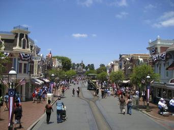 Keywords: Disneyland Main Street.jpg Disneyland's Main Street U S A with July 4th decorations own 2010-07-04 Alfred A Si Main Street USA at Disneyland