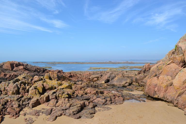 Keywords: distant scene rocky shore line jersey channel islands blue sky distant rock pools dreamy horizon perfect view sunny day