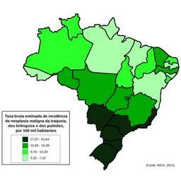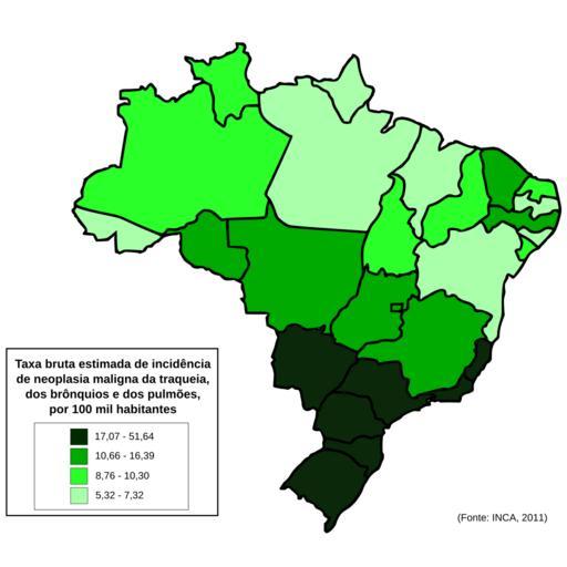 | Keywords: Distribuição câncer de pulmão Brasil.svg pt Representação espacial das taxas brutas de incidência de neoplasia maligna da traqueia dos brônquios e dos pulmões por 100 mil homens estimadas para o ano de 2012 segundo Unidade da Federação 2012-06-24 own Vinicius Siqueira Veja a tabela a seguir para informações adicionais wikitable collapsible collapsed colspan 4 Informações detalhadas<ref> cite book Instituto Nacional de Câncer José Alencar Gomes da Silva Estimativa 2012 incidência de câncer no Brasil Inca 2011 Rio de Janeiro 978-85-7318-194-4 http //www inca gov br/estimativa/2012/estimativa20122111 pdf pdf </ref> - UF Taxa bruta de incidência UF Taxa bruta de incidência - AC 6 97 PB 7 32 - AL 6 51 PE 11 21 - AM 9 06 PI 8 76 - AP 6 92 PR 24 80 - BA 7 09 RJ 23 86 - CE 10 85 RN 10 30 - DF 15 79 RO 10 66 - ES 17 07 RR 10 19 - GO 16 39 RS 51 64 - MA 5 32 SC 32 84 - MG 13 63 SE 9 87 - MS 20 48 SP 21 37 - MT 14 89 TO 9 54 - PA 7 00 References references cc-zero Uploaded with UploadWizard SVG files on lung cancer statistics Epidemiology Healthcare in Brazil |