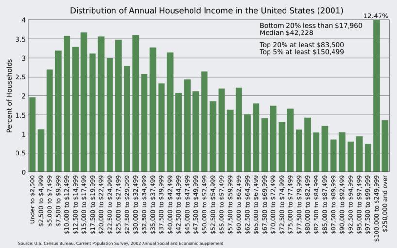 | Keywords: Distribution of Annual Household Income in the United States 2001.svg en Distribution of Annual Household Income in the United States in 2001 Based on US Census/Bureau of Labor Statistics data from the https //www census gov/hhes/www/cpstables/macro/032002/hhinc/toc htm Annual Social and Economic Supplement of the CPS 2016-03-14 own Delphi234 other versions cc-zero Income distribution in the United States | ||||