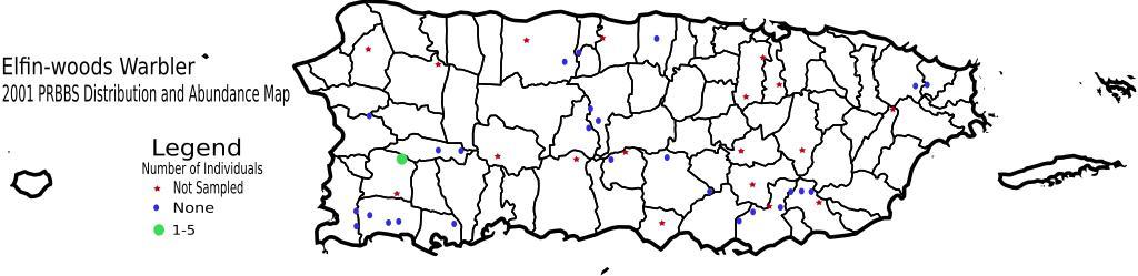 | Keywords: Distribution of the Elfin-woods Warbler 2001.svg Bird count map of the Elfin-woods Warbler Image created from data found at http //www pwrc usgs gov/bbs/Puerto_Rico/pr2001/pr2001_distribution/pr01ewwa gif and combined with data from http //www pwrc usgs gov/bbs/Puerto_Rico/pr1997/pr97g gif Locations are approximations 2006-03-03 own assumed Joelr31~commonswiki Setophaga angelae Parulidae distribution maps | ||||