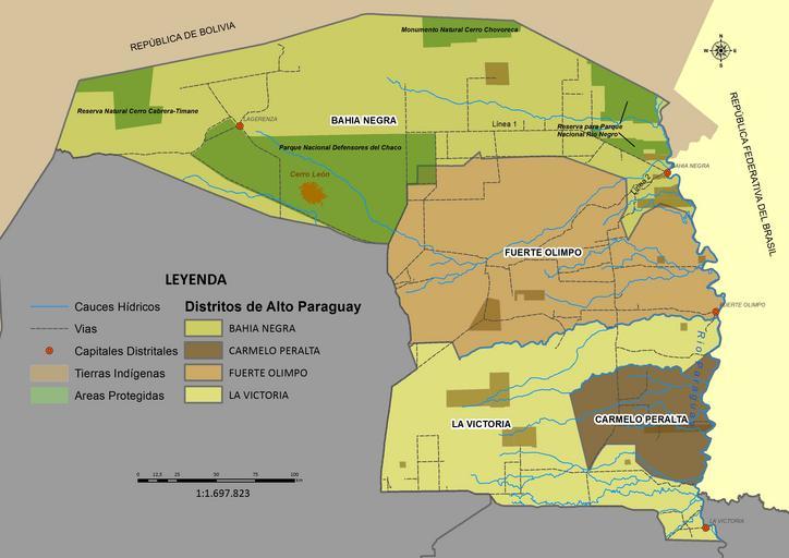 Keywords: Distritos de Alto Paraguay.jpg en Districts of the Department of Alto Paraguay and main elements of his geography Indigenous communities Protected areas Roads Rivers Cities own Fernandolpd 08-set-2011 Cc-zero Maps of Paraguay