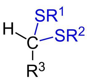 Keywords: Dithioacetal Structural Formula V.1.svg en Dithioacetal_General_Structure de Dithioacetal_Allgemeine_Formel own Jü 2012-05-05 Thioacetals Cc-zero