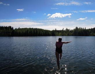 Keywords: dive in jump girl man child finnish lake landscape nature sky sun water clouds pond blue white beach