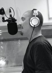 Keywords: DJGrind.jpg en DJGrind own Libertyjade-r 2009-10-09 Disc jockeys Men with microphones People with headphones Profile portrait photographs of men Black and white photographs of men
