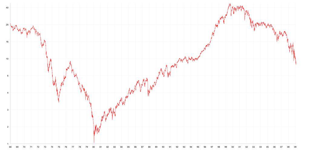 | Keywords: DJIA in Gold.png Long file description pages with source data long term chart in a logarithmic scale of the Dow/Gold ratio unit of DJIA measured in troy ounces of gold for the years 1968 ” 2009 till 11 Febuary Based the London Bullion Market Association http //www lbma org uk/stats/goldfixg Gold Fixings and the Dow Jones Averages Report on the http //www djaverages com/ view industrial page reports show performance symbol DJI Dow Jones Industrial Average free subscription Emilfaro 2009-02-12 The data wikitable collapsible collapsed Date Dow Gold Ratio - 1/2/68 906 84 35 181 25 78 - 1/3/68 904 13 35 159 25 72 - 1/4/68 899 39 35 141 25 59 - 1/5/68 901 24 35 140 25 65 - 1/8/68 908 92 35 138 25 87 - 1/9/68 908 29 35 138 25 85 - 1/10/68 903 95 35 149 25 72 - 1/11/68 899 79 35 170 25 58 - 1/12/68 898 98 35 176 25 56 - 1/15/68 892 74 35 183 25 37 - 1/16/68 887 14 35 188 25 21 - 1/17/68 883 78 35 196 25 11 - 1/18/68 882 80 35 195 25 08 - 1/19/68 880 32 35 194 25 01 - 1/22/68 871 71 35 190 24 77 - 1/23/68 864 77 35 193 24 57 - 1/24/68 862 23 35 198 24 50 - 1/25/68 864 25 35 196 24 56 - 1/26/68 865 06 35 198 24 58 - 1/29/68 863 67 35 194 24 54 - 1/30/68 859 57 35 190 24 43 - 1/31/68 855 47 35 196 24 31 - 2/1/68 861 36 35 196 24 47 - 2/2/68 863 56 35 196 24 54 - 2/5/68 861 13 35 193 24 47 - 2/6/68 861 25 35 191 24 47 - 2/7/68 859 92 35 196 24 43 - 2/8/68 850 32 35 194 24 16 - 2/9/68 840 04 35 195 23 87 - 2/12/68 840 04 35 193 23 87 - 2/13/68 831 77 35 193 23 63 - 2/14/68 837 38 35 195 23 79 - 2/15/68 839 23 35 198 23 84 - 2/16/68 836 34 35 198 23 76 - 2/19/68 838 65 35 198 23 83 - 2/20/68 843 10 35 196 23 95 - 2/21/68 849 23 35 198 24 13 - 2/22/68 849 23 35 198 24 13 - 2/23/68 849 80 35 198 24 14 - 2/26/68 841 77 35 196 23 92 - 2/27/68 846 68 35 196 24 06 - 2/28/68 844 72 35 198 24 00 - 2/29/68 840 50 35 199 23 88 - 3/1/68 840 44 35 199 23 88 - 3/4/68 830 56 35 198 23 60 - 3/5/68 827 03 35 199 23 50 - 3/6/68 837 21 35 199 23 79 - 3/7/68 836 22 35 198 23 76 - 3/8/68 835 24 35 198 23 73 - 3/11/68 843 04 35 199 23 95 - 3/12/68 843 22 35 196 23 96 - 3/13/68 842 23 35 198 23 93 - 3/14/68 830 91 35 199 23 61 - 3/15/68 837 55 35 199 23 79 - 3/18/68 840 09 35 199 23 87 - 3/19/68 832 99 35 199 23 67 - 3/20/68 830 85 35 199 23 60 - 3/21/68 825 13 35 199 23 44 - 3/22/68 826 05 35 199 23 47 - 3/25/68 827 27 35 199 23 50 - 3/26/68 831 54 35 199 23 62 - 3/27/68 836 57 35 199 23 77 - 3/28/68 835 12 35 199 23 73 - 3/29/68 840 67 35 199 23 88 - 4/1/68 861 25 37 700 22 84 - 4/2/68 863 96 37 300 23 16 - 4/3/68 869 11 37 600 23 11 - 4/4/68 872 52 36 950 23 61 - 4/5/68 865 81 37 000 23 40 - 4/8/68 884 42 37 050 23 87 - 4/9/68 884 42 37 500 23 58 - 4/10/68 892 63 37 700 23 68 - 4/11/68 905 69 38 000 23 83 - 4/15/68 910 19 38 000 23 95 - 4/16/68 906 78 38 000 23 86 - 4/17/68 908 17 37 800 24 03 - 4/18/68 909 21 37 550 24 21 - 4/19/68 897 65 37 650 23 84 - 4/22/68 891 99 38 000 23 47 - 4/23/68 897 48 38 400 23 37 - 4/24/68 898 46 38 250 23 49 - 4/25/68 905 57 38 300 23 64 - 4/26/68 906 03 38 650 23 44 - 4/29/68 908 34 38 750 23 44 - 4/30/68 912 22 39 100 23 33 - 5/1/68 913 20 39 200 23 30 - 5/2/68 918 05 39 450 23 27 - 5/3/68 919 21 39 100 23 51 - 5/6/68 914 53 39 750 23 01 - 5/7/68 919 90 39 300 23 41 - 5/8/68 918 86 39 750 23 12 - 5/9/68 911 35 39 700 22 96 - 5/10/68 912 91 39 600 23 05 - 5/13/68 909 96 39 500 23 04 - 5/14/68 908 06 39 800 22 82 - 5/15/68 907 82 40 250 22 55 - 5/16/68 903 72 42 250 21 39 - 5/17/68 898 98 41 500 21 66 - 5/20/68 894 19 42 300 21 14 - 5/21/68 896 32 42 400 21 14 - 5/22/68 896 79 41 550 21 58 - 5/23/68 893 15 41 400 21 57 - 5/24/68 895 28 41 750 21 44 - 5/27/68 891 60 41 500 21 48 - 5/28/68 896 78 41 500 21 61 - 5/29/68 895 21 41 600 21 52 - 5/30/68 895 21 41 950 21 34 - 5/31/68 899 00 41 950 21 43 - 6/3/68 905 38 41 950 21 58 - 6/4/68 916 63 41 150 22 28 - 6/5/68 907 42 41 200 22 02 - 6/6/68 910 13 41 200 22 09 - 6/7/68 914 88 41 250 22 18 - 6/10/68 913 38 41 300 22 12 - 6/11/68 917 95 41 550 22 09 - 6/12/68 917 95 41 900 21 91 - 6/13/68 913 86 41 300 22 13 - 6/14/68 913 62 41 000 22 28 - 6/17/68 903 45 40 700 22 20 - 6/18/68 900 20 41 100 21 90 - 6/19/68 900 20 41 400 21 74 - 6/20/68 898 28 41 100 21 86 - 6/21/68 900 93 41 050 21 95 - 6/24/68 901 83 40 900 22 05 - 6/25/68 901 41 40 950 22 01 - 6/26/68 901 41 40 850 22 07 - 6/27/68 898 76 40 900 21 97 - 6/28/68 897 80 40 900 21 95 - 7/1/68 896 35 40 800 21 97 - 7/2/68 896 84 40 900 21 93 - 7/3/68 903 51 41 050 22 01 - 7/4/68 903 51 41 150 21 96 - 7/5/68 903 51 41 000 22 04 - 7/8/68 912 60 40 850 22 34 - 7/9/68 920 42 39 800 23 13 - 7/10/68 920 42 40 100 22 95 - 7/11/68 922 82 39 100 23 60 - 7/12/68 922 46 39 300 23 47 - 7/15/68 923 72 39 200 23 56 - 7/16/68 921 20 38 500 23 93 - 7/17/68 921 20 37 750 24 40 - 7/18/68 917 95 38 000 24 16 - 7/19/68 913 92 38 700 23 62 - 7/22/68 900 32 38 600 23 32 - 7/23/68 898 10 39 000 23 03 - 7/24/68 898 10 39 200 22 91 - 7/25/68 885 47 38 900 22 76 - 7/26/68 888 47 38 900 22 84 - 7/29/68 883 36 39 100 22 59 - 7/30/68 883 00 39 000 22 64 - 7/31/68 883 00 38 850 22 73 - 8/1/68 878 07 38 900 22 57 - 8/2/68 871 27 38 850 22 43 - 8/5/68 872 53 38 950 22 40 - 8/6/68 876 92 38 700 22 66 - 8/7/68 876 92 38 700 22 66 - 8/8/68 870 37 38 450 22 64 - 8/9/68 869 65 38 550 22 56 - 8/12/68 881 02 38 600 22 82 - 8/13/68 884 68 38 900 22 74 - 8/14/68 884 68 38 950 22 71 - 8/15/68 879 51 39 150 22 47 - 8/16/68 885 89 39 150 22 63 - 8/19/68 887 68 39 150 22 67 - 8/20/68 888 67 39 550 22 47 - 8/21/68 888 67 40 000 22 22 - 8/22/68 888 30 39 750 22 35 - 8/23/68 892 34 39 500 22 59 - 8/26/68 896 13 39 500 22 69 - 8/27/68 893 65 39 650 22 54 - 8/28/68 893 65 39 600 22 57 - 8/29/68 894 33 39 850 22 44 - 8/30/68 896 01 39 800 22 51 - 9/3/68 900 36 39 950 22 54 - 9/4/68 906 95 39 900 22 73 - 9/5/68 917 52 40 100 22 88 - 9/6/68 921 25 39 900 23 09 - 9/9/68 924 98 40 050 23 10 - 9/10/68 919 38 40 025 22 97 - 9/11/68 919 38 40 100 22 93 - 9/12/68 915 65 40 100 22 83 - 9/13/68 917 21 40 150 22 84 - 9/16/68 921 37 40 300 2
