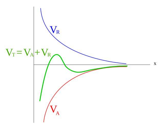 | Keywords: DLVO1.svg en Combined effect of van der Waals and double layer force according to the DLVO theory<br> V<sub>A</sub> - van der Waals attraction V<sub>R</sub> - electrostatic repulsion V<sub>T</sub> - resulting effect total forces hu A van der Waals-féle erők és az elektrosztatikus taszítóerők eredője a DLVO-elmélet szerint<br> V<sub>A</sub> van der Waals-féle vonzóerők V<sub>R</sub> elektrosztatikus taszítóerők V<sub>T</sub> eredő ru Равновесие потенциальной эне гии п итяжения и потенциальной эне гии отталкивания по тео ии ДЛФО<br> V<sub>A</sub> - Ван-де -ваальсовы силы п итяжения V<sub>R</sub> элект остатические силы отталкивания V<sub>T</sub> сумма ный own kifo 2010-08-08 Colloids |