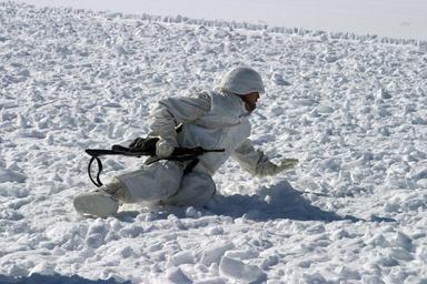 | Keywords: DM-SD-06-06320.JPEG A Japanese Ground Self Defense Force JGSDF Soldier from the 20th Infantry Regiment dressed in white cold-weather gear armed with a Howa 5 56 mm Type 89 assault rifle high crawls to get into position to engage targets downrange during a live fire exercise conducted at the snow covered Ojojibara Maneuver Area of Sendai Japan while participating in Exercise FOREST LIGHT 2004 Forest Light is a bi-lateral training exercise conducted between the US Marine Corps USMC and the JGSDF source http //www dodmedia osd mil/DVIC_View/Still_Details cfm SDAN DMSD0606320 JPGPath /Assets/Still/2006/Marines/DM-SD-06-06320 JPG PD-USGov JSDF Type 88 helmet Type 89 rifle Winter and mountain warfare Crawling men Forest Light 2004 20th Infantry Regiment Japan Uniforms of the JGSDF JSDF Type 88 helmet |