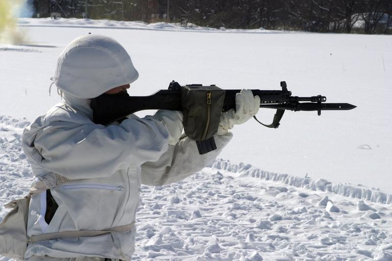 Keywords: DM-SD-06-06321.JPEG A Japanese Ground Self Defense Force JGSDF Soldier from the 20th Infantry Regiment dressed in white cold-weather gear engages targets down range with his Howa 5 56 mm Type 89 assault rifle during a live fire exercise conducted at the snow covered Ojojibara Maneuver Area of Sendai Japan while participating in Exercise FOREST LIGHT 2004 Forest Light is a bi-lateral training exercise conducted between the US Marine Corps USMC and the JGSDF source http //www dodmedia osd mil/DVIC_View/Still_Details cfm SDAN DMSD0606321 JPGPath /Assets/Still/2006/Marines/DM-SD-06-06321 JPG PD-USGov Type 89 rifle Winter and mountain warfare Forest Light 2004 20th Infantry Regiment Japan JSDF Type 88 helmet |