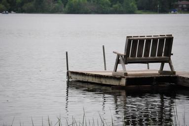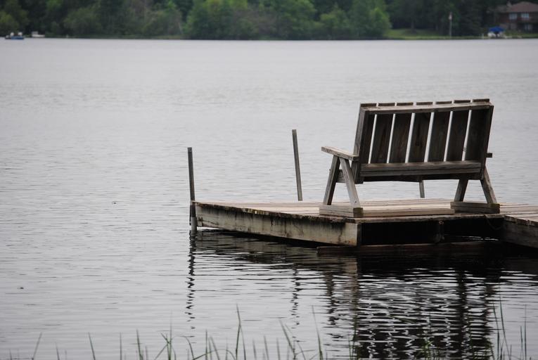 Keywords: dock lake bench water calm peaceful vacation outdoors serene relaxation