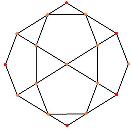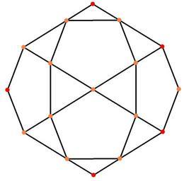 Keywords: Dodecahedron t1 v.png en icosahedron projection own 11/15/11 Tom Ruen Set of colored Coxeter plane graphs red orange yellow green vertices