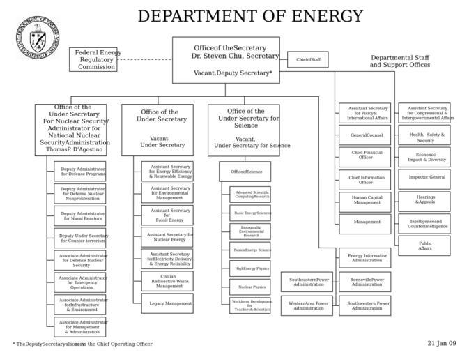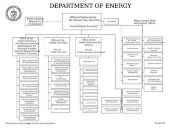 | Keywords: DOE OrgChart 012209.svg en U S Dept of Energy org chart as of January 21 2009 http //www energy gov/organization/orgchart htm U S Department of Energy 2009-01-21 DOE_Org_Chart jpg File converted from DOE's PDF to SVG PD-USGov Organizational charts of the United States Department of Energy |