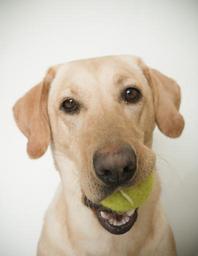 Keywords: Yellow Labrador retriever. Tennis ball in mouth.