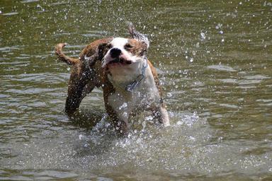 Keywords: dog american stefford race puppies dogs splashing play playful shake shower wet spray inject water splashes water summer cooling cool down
