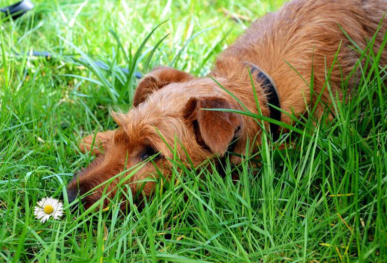 Keywords: dog animal daisy meadow summer relaxation rest fur terrier green grass trusting pet friend