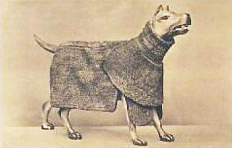 | Keywords: Dog Armour.jpg fact en A German 17th century war dog represented by a statue in protective armour consisting of chain mail and steel helmet Formerly in the Rüstkammer Collection of Wartburg Castle Germany G Reimer Kunsthandbuch für Deutschland published by Königliche Museen zu Berlin 1904 Author 1904 or earlier PD-old Grotesque armour Military working dogs of Germany Statues of dogs |