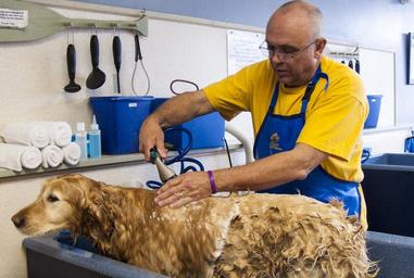 Keywords: dog bath resigned wet soapy grooming animal canine companion lather