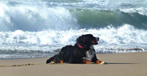 Keywords: dog bernese mountain dog canine pet beach waves pedigree domestic sitting black mammal