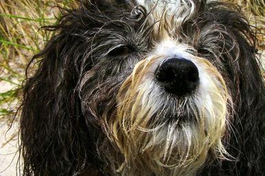 Keywords: dog bitch animal mammal pet hybrid dog look most beach wet dog tousled blink eyes watch black and white sweet sandy