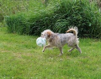 Keywords: dog bitch garden play ball pride sublime fun animal hybrid brown good awakened friendship